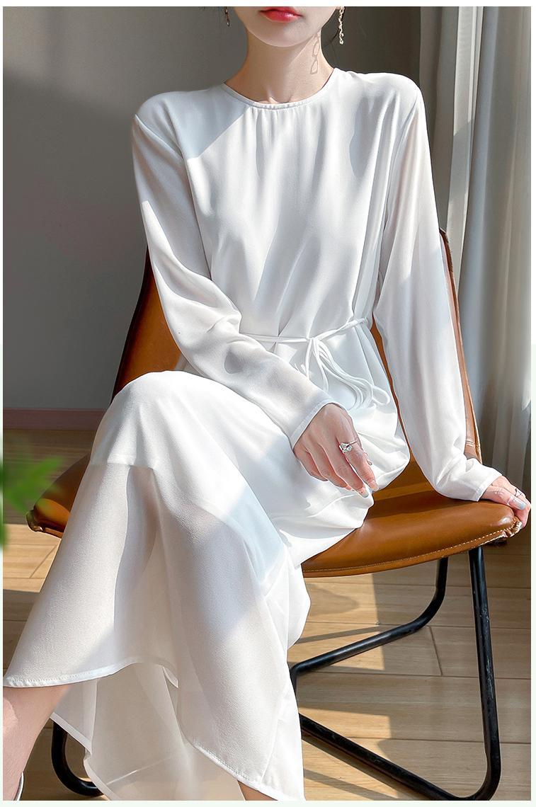 Dress, female, 100% polyester fiber, white, double-layer long sleeved round neck dress