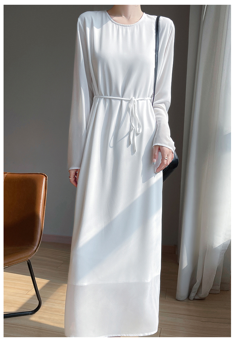 Style: Round neck long sleeved dress; Fabric: 100% polyester fiber