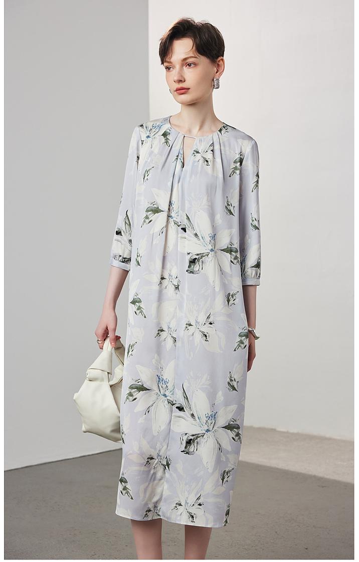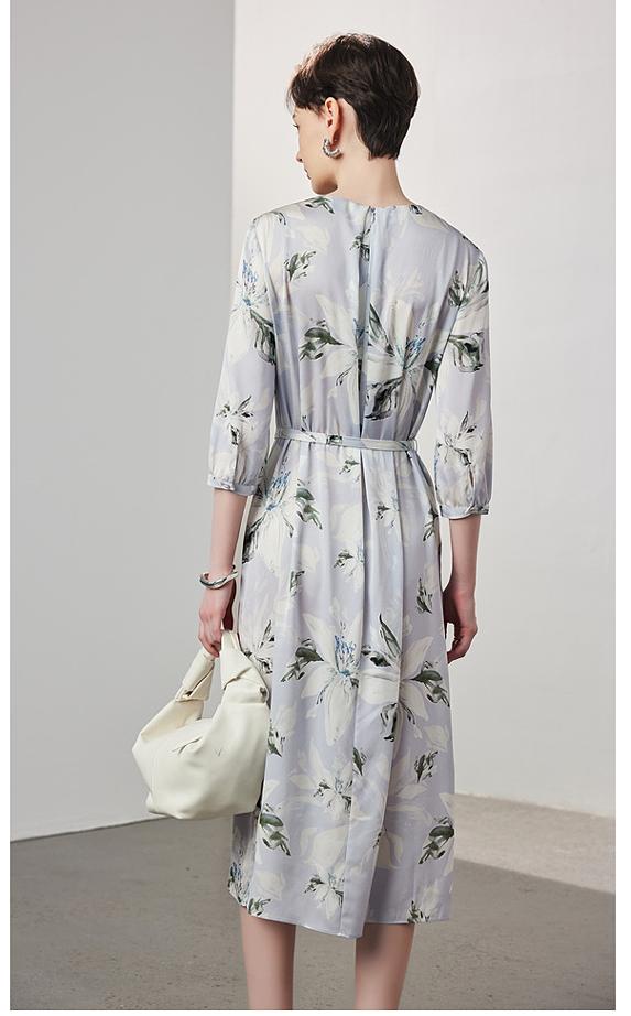 Dress, female, 100% mulberry silk, light purple white, elegant temperament, large floral round neck dress