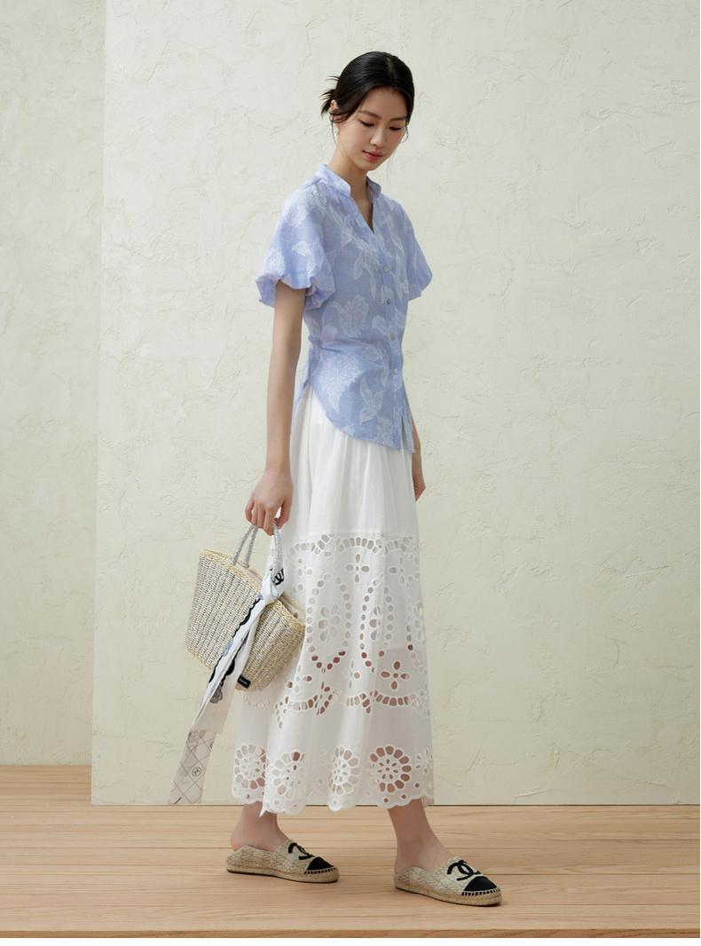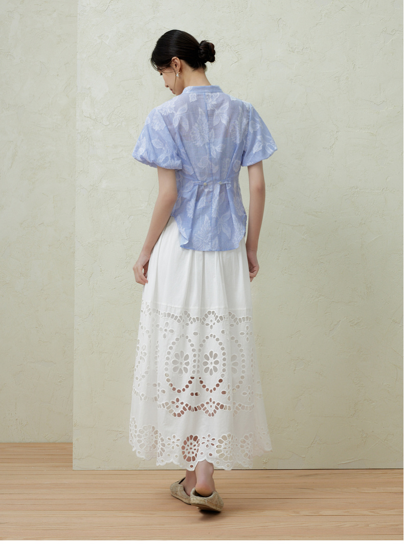 Taking inspiration from the lazy French style, we customize hollowed out lace to awaken the vitality of summer, creating a complex yet orderly atmosphere. Easily create a visually layered layout, optimize body proportions with high waists, and create an A-line large skirt that exudes a sense of vitality and elegance while walking.
