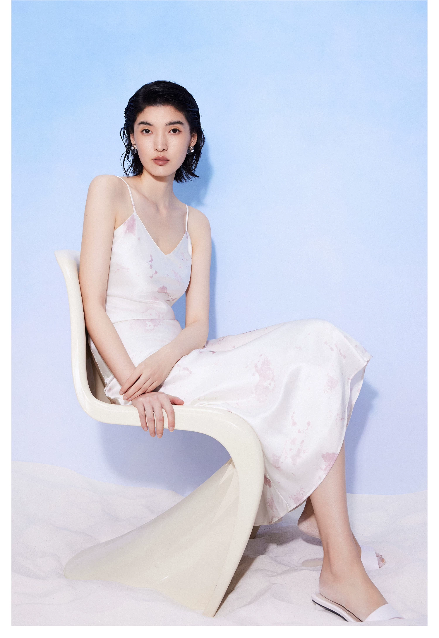 The V-neck design of the sling highlights the shoulder neck line and modifies the proportion of the shoulders, giving the shape a sense of agility and delicacy