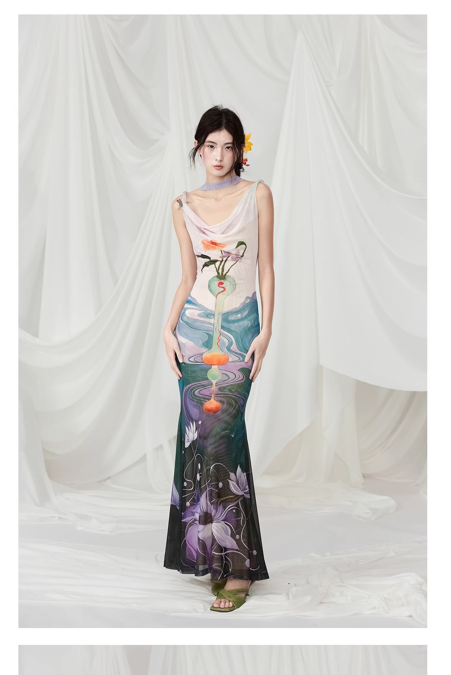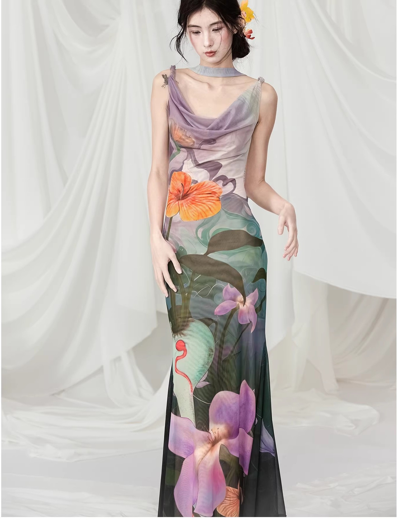 Two original illustrations by collaborating illustrators, combining modern digital printing technology with Chinese elements to add artistic flair. Using elastic mesh fabric, it is lightweight and breathable, suitable for spring and summer wear, while providing good fit to adapt to different body types. It can be worn in both front and back, making it more cost-effective. The modern Western style cut with a dangling collar design adds a sense of fashion, while the inserted fishtail skirt highlights the curves of the hips and thighs, making the skirt more elegant and dynamic. Suitable for dating, vacation, light socializing and other occasions, showcasing the unique charm of women’s softness and independence. (Fabric delicate, avoid sharp objects, do not machine wash).