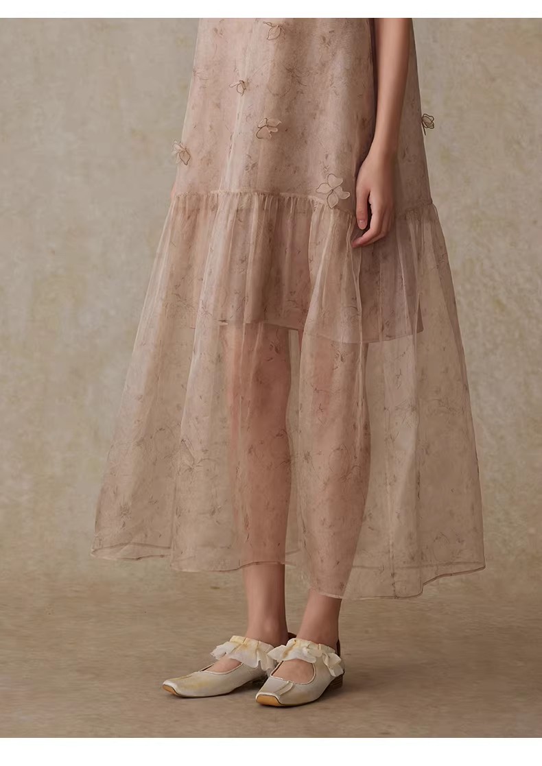 Embroider the dance moves of flying flowers onto a lightweight silk long dress, with a high neckline extending backwards as a long band to complement the backless V-neck. Pinch the hem of the skirt to create a micro doll like silhouette, allowing you to easily attend appointments and experience every romantic moment.