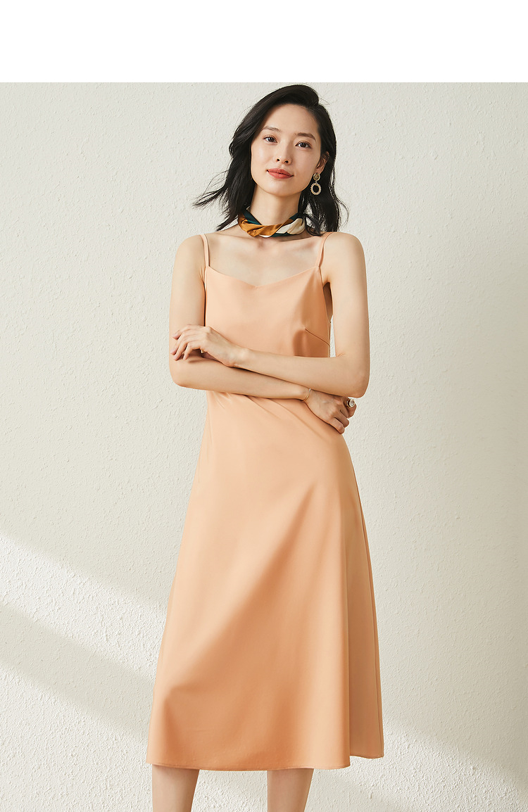 A solid color camisole skirt with adjustable shoulder straps, with a well fitted cut that outlines the lines from the shoulders to the hips very beautifully. The loose design of the half fish tail below the hip circumference enhances the soft and graceful figure, making it both sexy and elegant when worn alone. It also looks great when paired with a cover up shirt